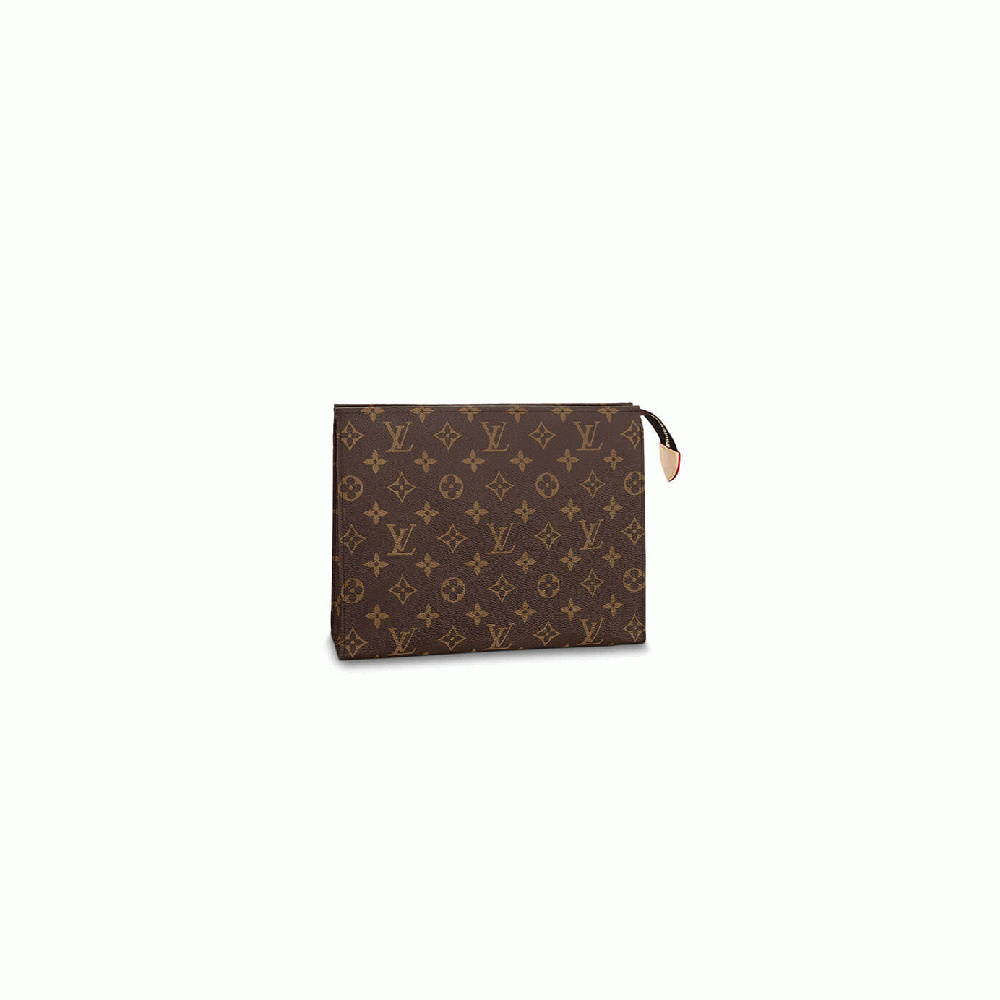 Replica LV Toiletry Pouch 26 Style: M47542 Size: 9.8”W x 7.9”H x 2”D Monogram canvas Golden brass zip closure with leather tab Washable lining, gusset sides